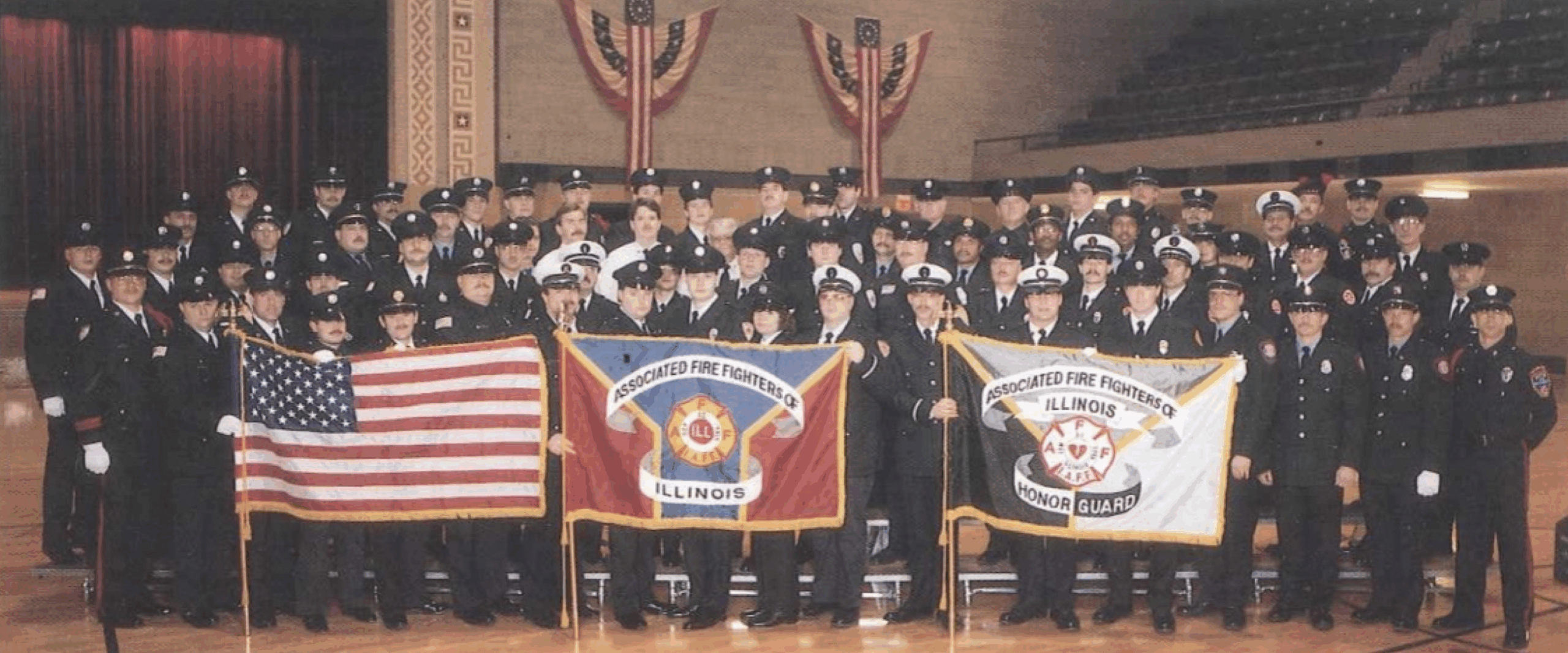 On January 30, 1993, Illinois union rank and file firefighters from across the state came together in Springfield to try something new. Something that some would say could not be done, because it had never been done before. That was to organize a statewide firefighter honor guard and as a line of duty death benefit, assist and guide in the conducting and performance of fallen firefighter line of duty funeral services. We inducted our colors, the AFFI flag and the AFFI Honor Guard flag, presented honor guard rocker patches for the uniform and asked 69 firefighters to uphold and maintain the traditions of the fire service.
