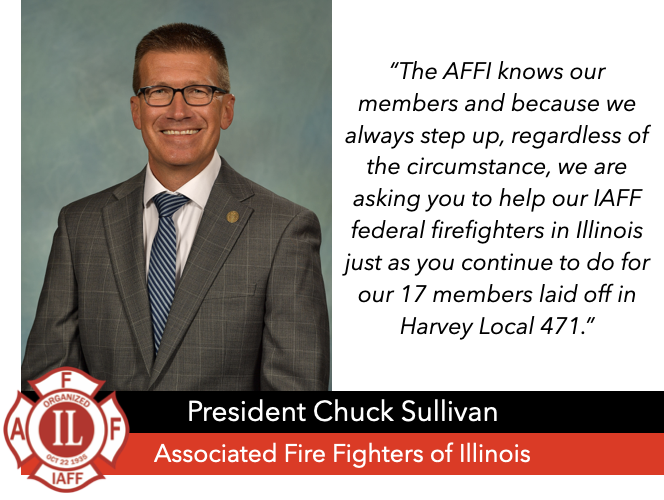 The AFFI knows our members and because we always step up, regardless of the circumstance, we are asking you to help our IAFF federal firefighters in Illinois just as you continue to do for our 17 members laid off in Harvey Local 471. Harvey Local 471 Go Fund Me link here: