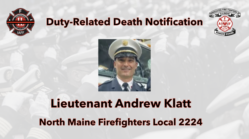 It is with great sadness that I inform you of the duty related death of Brother Andy Klatt of North Maine Firefighter’s Local 2224. Brother Klatt passed away Tuesday, April 14th, 2026, from occupational cancer. Brother Klatt was 47 years old. He is survived by his wife, Rebecca.